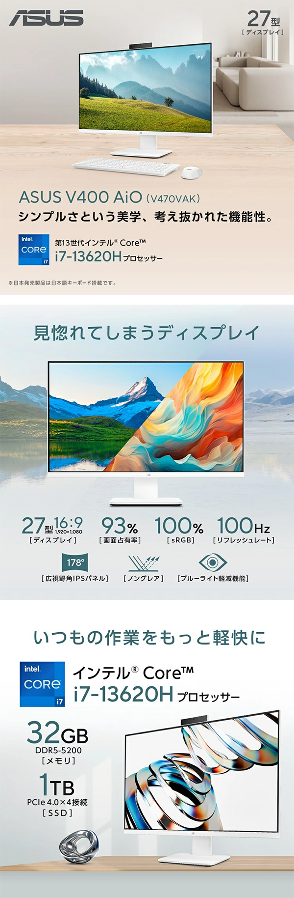 - ASUS V400 AiO (V470VAK) V470VAK-WPE092Wは、27型フルHDディスプレイを備え、Core i7-13620H、32GBメモリ、1TB SSDを搭載した高性能な液晶一体型パソコンです。