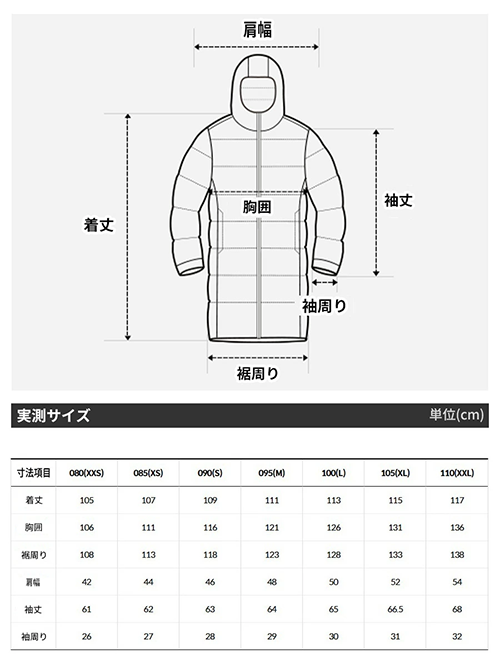 - 素材 表地はポリエステル100%、裏地はナイロン100%、中綿はダウン80%、フェザー20%の混紡素材がメイン