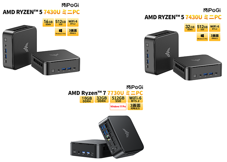 - NiPoGi E3Bは、AMD Ryzen 5 7430UまたはRyzen 7 7730Uを搭載し、メモリ16GBまたは32GB、SSD 512GBの構成で提供されるコストパフォーマンスに優れたミニPCです。