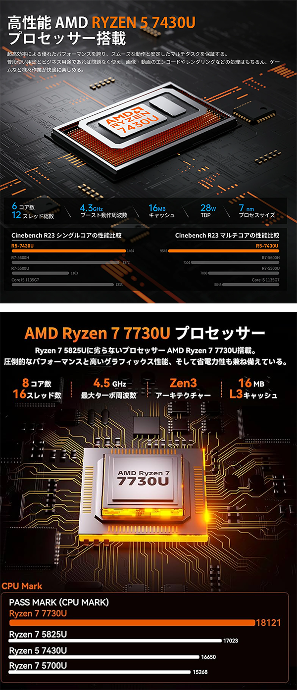 - プロセッサ CPU:AMD R5 7430U/AMD Ryzen7 7730U