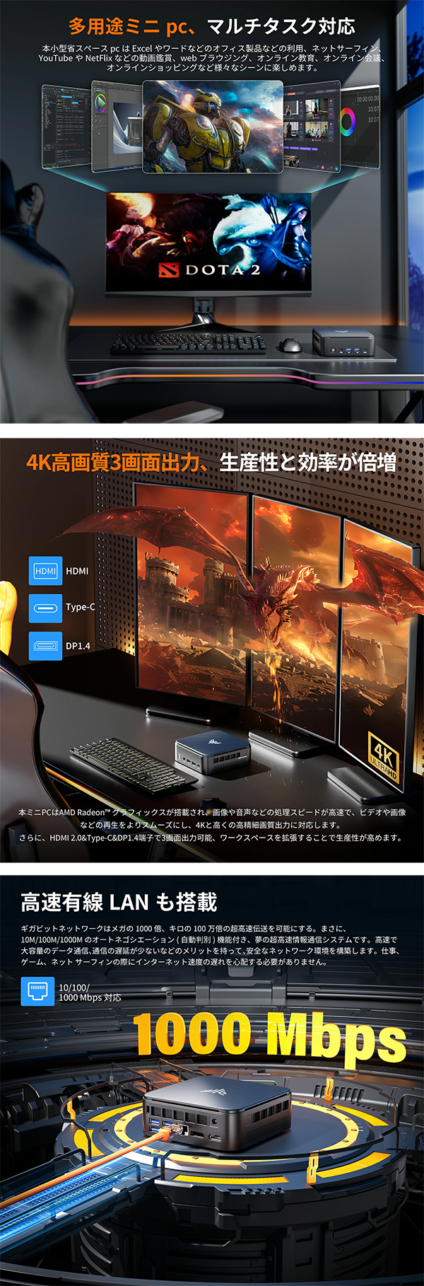 - 4K解像度の3画面同時出力に対応しており、効率的なマルチディスプレイ環境を構築できます。