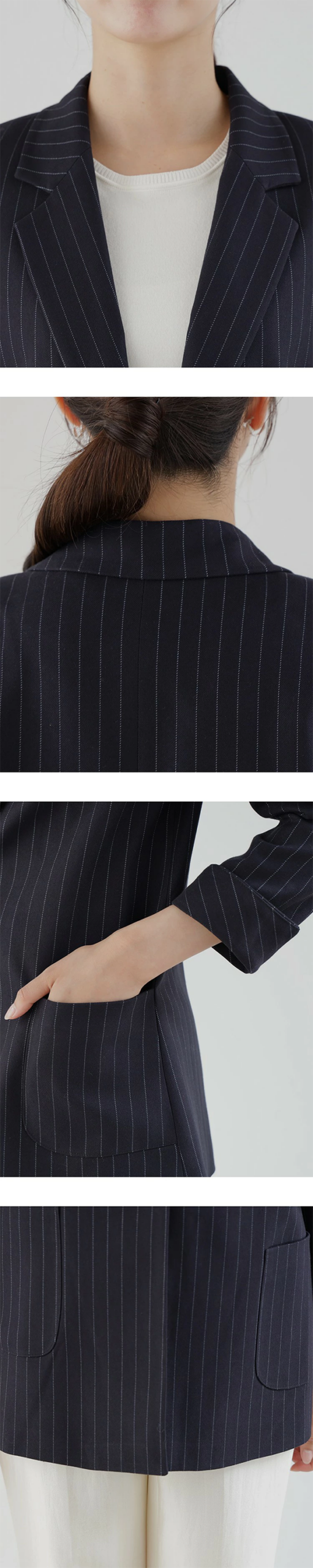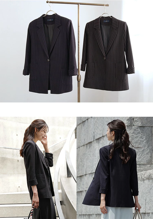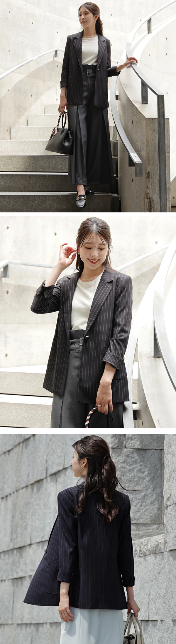 - トレンドの長め丈が日常使いでも着回せるストライプのスーツジャケットシックな色合いとピンストライプの柄がかっこいい大人の女性を演出。