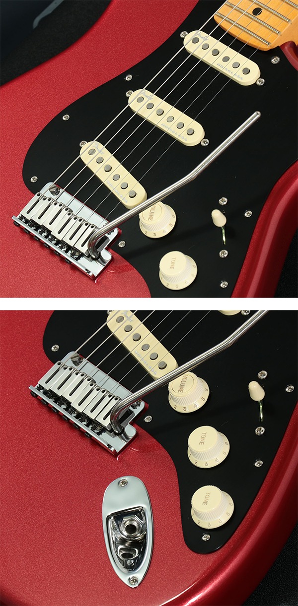- アルダー・ボディ、モダンDシェイプのメイプルネック、10-14Rのコンパウンドラディアス指板、蓄光サイドドット、アノダイズドピックガード、アメリカ・ウルトラ・トレモロ、PUはUltra II Noiseless Vintage Stratx3、VolノブにS-1スイッチが採用されています。