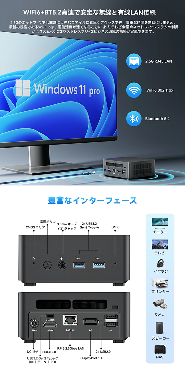 - ワイヤレス接続 M.2 2230 WIFI Support (Wi-Fi6E,BlueTooth 5.2)