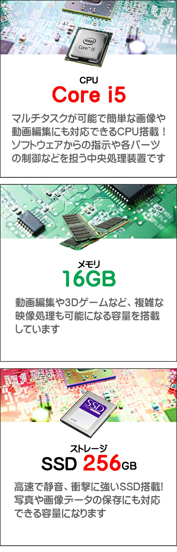 - ストレージ: 高速なNVMe SSD 256GBを搭載。