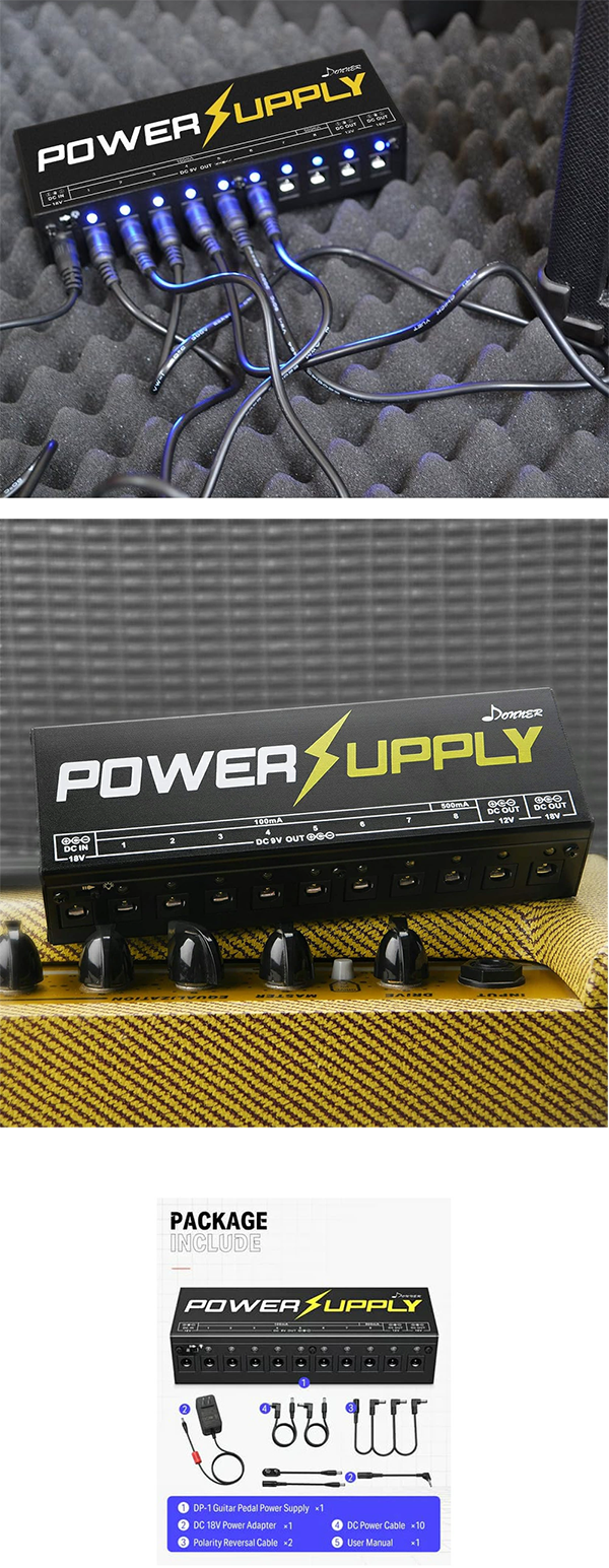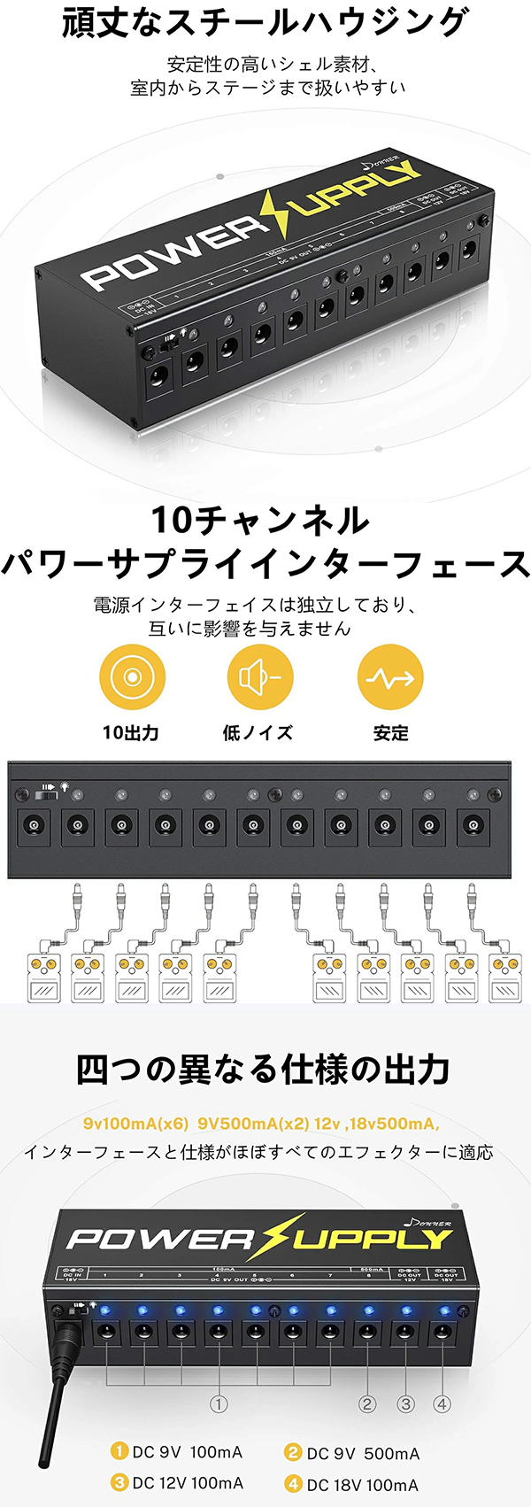 - Donner DP-1は、9V、12V、18Vの3種類の電圧に対応した10出力のエレキギターエフェクター用パワーサプライです。