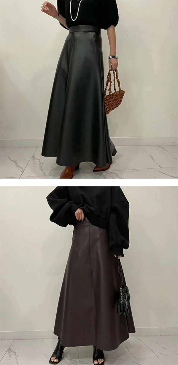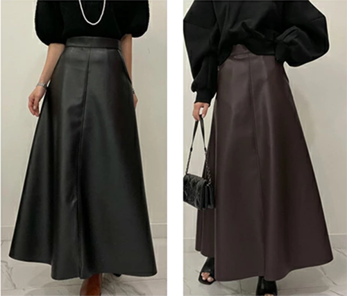 ▶ 艶感×美ラインで魅せる。大人の品格漂うフェイクレザーフレアスカート