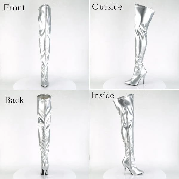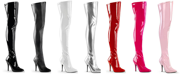 - 「Pleaser (プリーザー)」ブランドの「SEDUCE-3000」は、ニーハイ・サイハイ丈、エナメル素材、ポインテッドトゥ、ピンヒールを特徴とするブーツです。