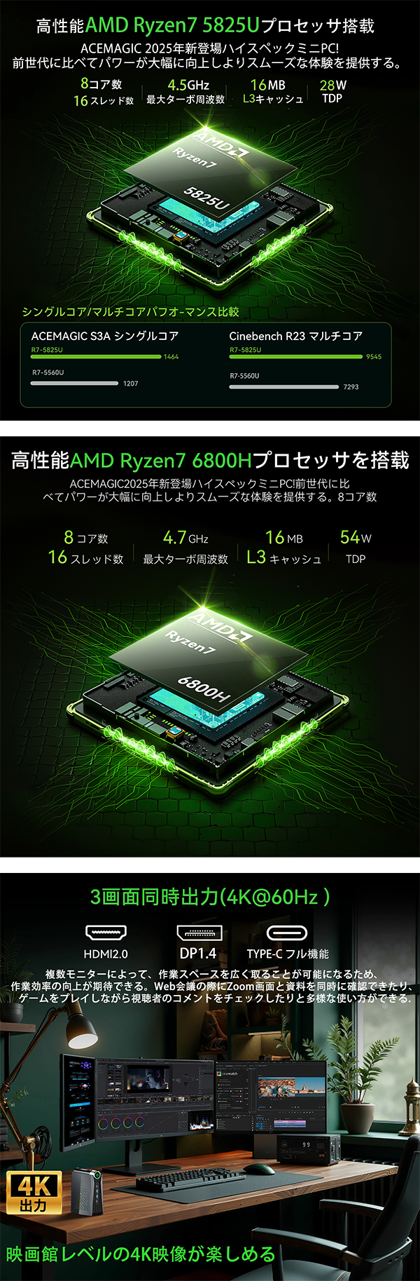 Toggle【商品の説明】新品 ミニデスクトップパソコン PC ACEMAGIC S3A Windows11 CPU AMD Ryzen7 5825U/6800H メモリ 16/32GB SSD 512GB/1TB 無線LAN Wi-Fi6 モニター なし 3画面同時出力