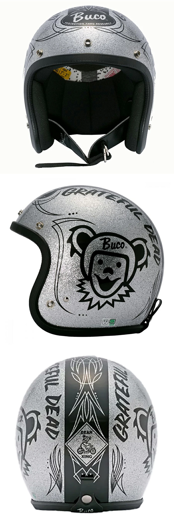 - BUCO(ブコ)の「EXTRA BUCO GRATEFUL DEAD(エクストラブコ・グレイトフルデッド)」ジェットヘルメットは、愛嬌のあるダンシングベアのデザインが特徴の人気の限定モデルです。