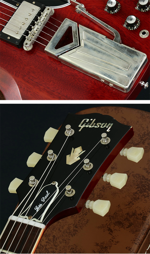 - ギブソン・カスタムショップ・ヒストリック・コレクション60th・アニバーサリー・1961 SG。ソリッド・マホガニー・ボディ、ロングレノン・ジョイントのマホガニー・ネック、チューブレス・トラスロッド、ローズ指板、PUはCustombuckerを搭載し、2コブのクルーソン・ペグ、サイドウェイ・ヴィブラート、ナイロンナット、VOS仕様で60th Anniversary SGバックプレートを装着しています。