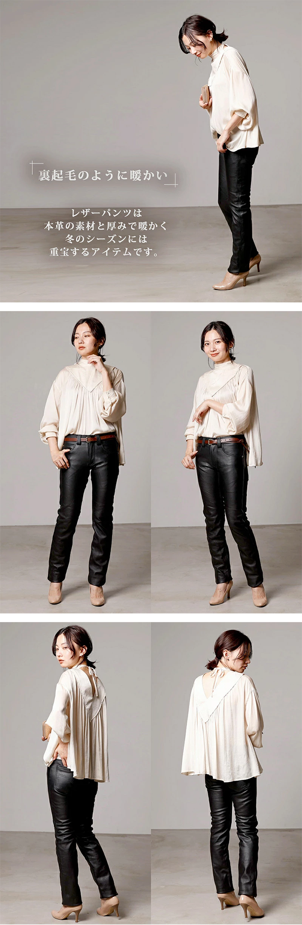 - 動きやすさはもちろん。女性らしいシルエットはくずさず、しっとりしたレザーは他のパンツにはない軽やかな履き心地です。