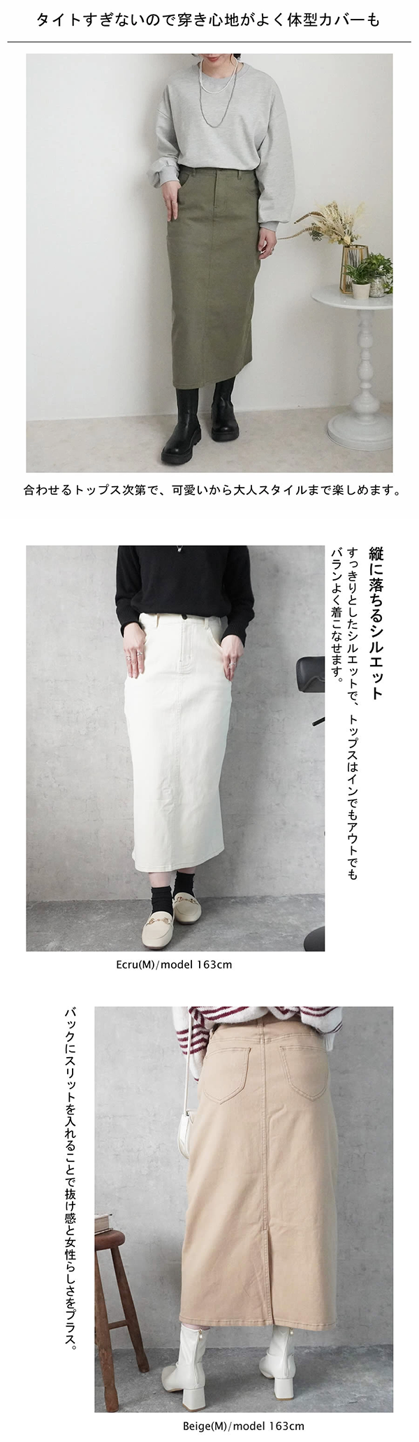 - 体型を拾いすぎないセミタイトデザインなので腰ハリさんでも綺麗に着こなせます