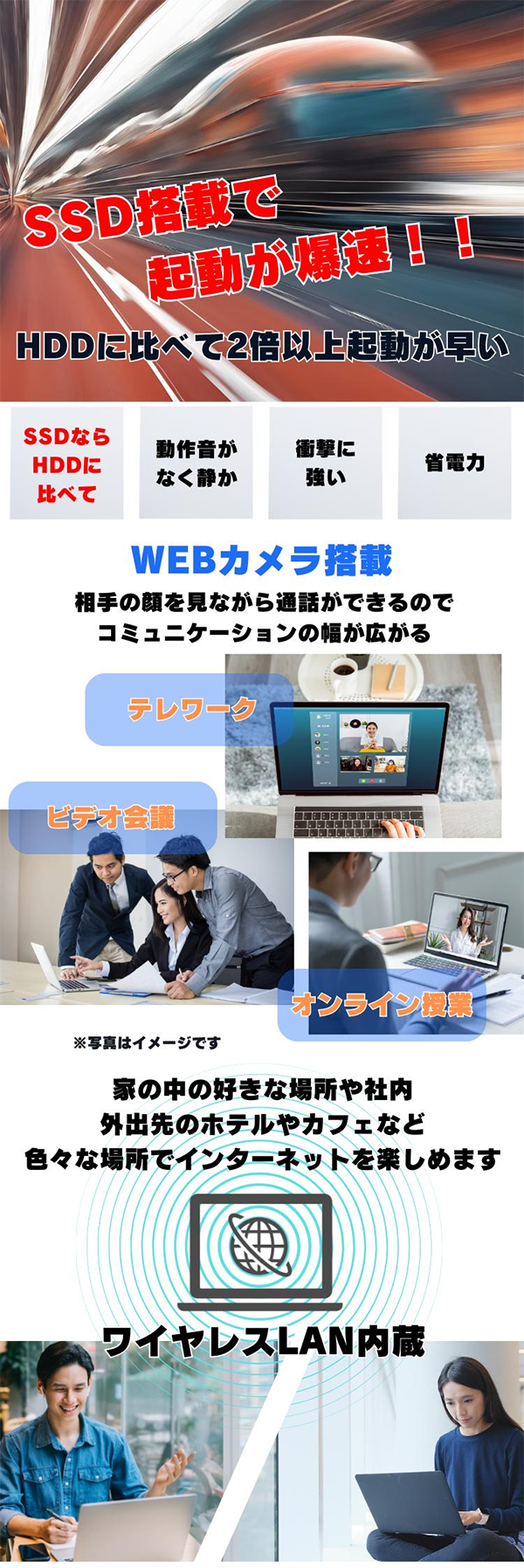 - SSD搭載により、OSやプログラムの起動、データの読み書きが高速です。