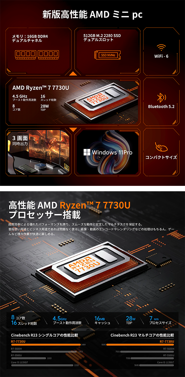 - プロセッサ CPU:AMD Ryzen 7 7730U コア数:8 スレッド総数:16 ブースト動作周波数:4.5 GHz キャッシュ:16MB TDP:28W