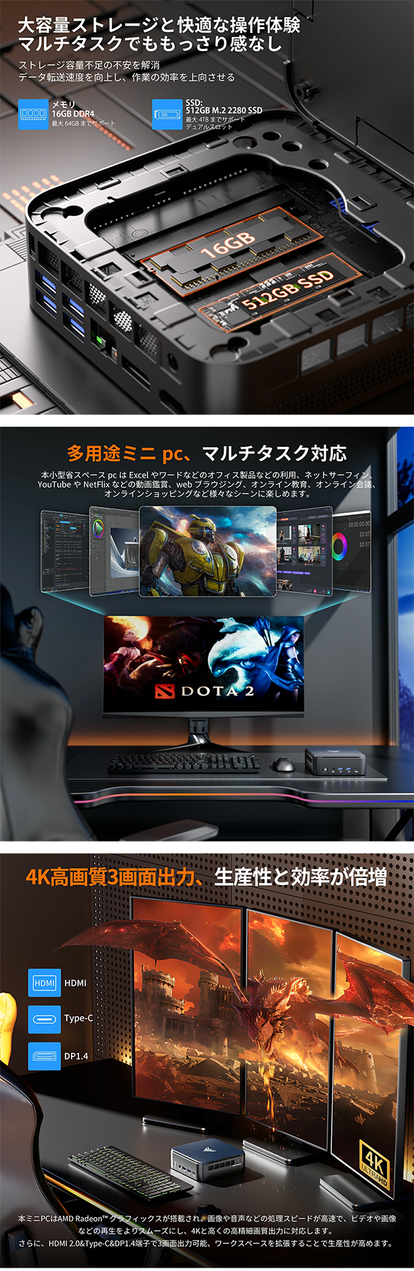 【商品の説明】新品 ミニデスクトップパソコン PC NiPoGi E3B Windows11 CPU AMD Ryzen7 7730U メモリ 16GB SSD 512GB 無線LAN Wi-Fi6 モニター なし 3画面同時出力/h3>▶ 【3画面同時出力】MiniPC AMD Ryzen7 7730U メモリ 16GB SSD 512GB