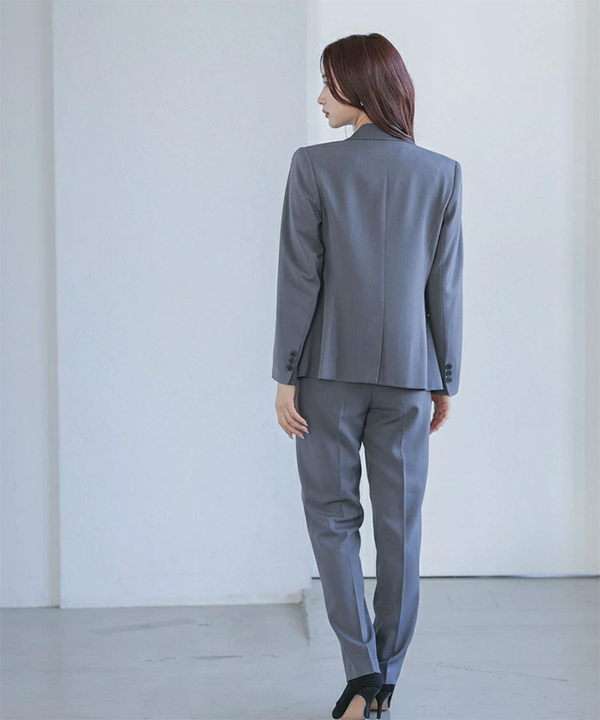 - スリムなジャケットと細身のスラックスパンツが大人かっこいいデザイン。