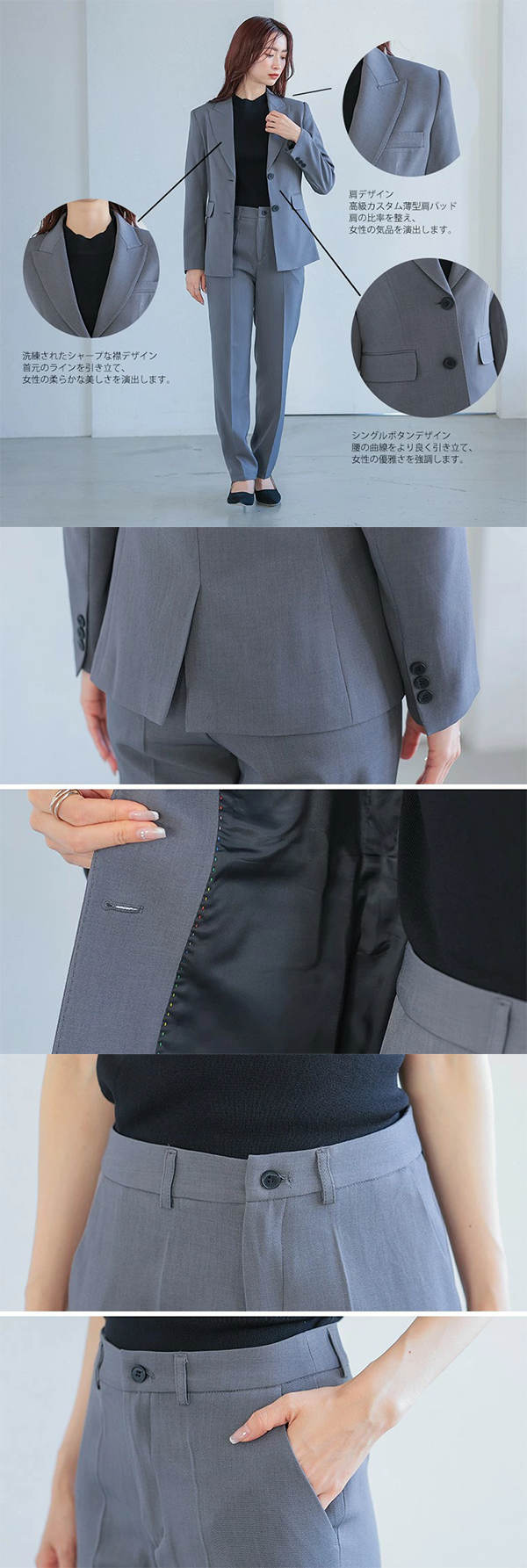 - スリムなラインがビジネスシーンに映える大人ジャケットとスラックスパンツのスーツ上下2点セット。