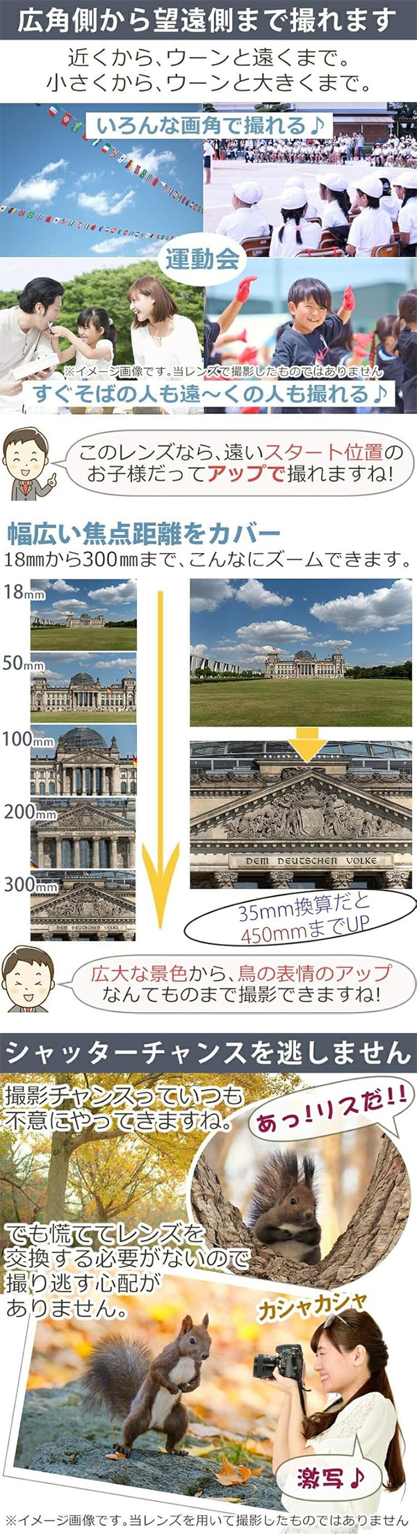 - APS-Cサイズミラーレス用として世界初の16.6倍のズーム比を実現しています。