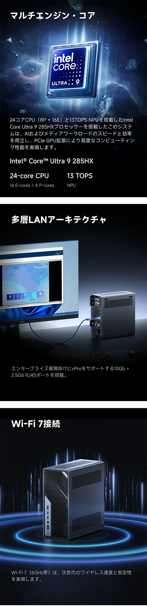 - 有線接続 2 × 25 GbE SFP+( Intel E810) 1 × 10 GbE LAN RJ45 ( Realtek RTL8127) 1 × 2.5 GbE LAN RJ45(Intel I226-LM|Intel vPro 対応)