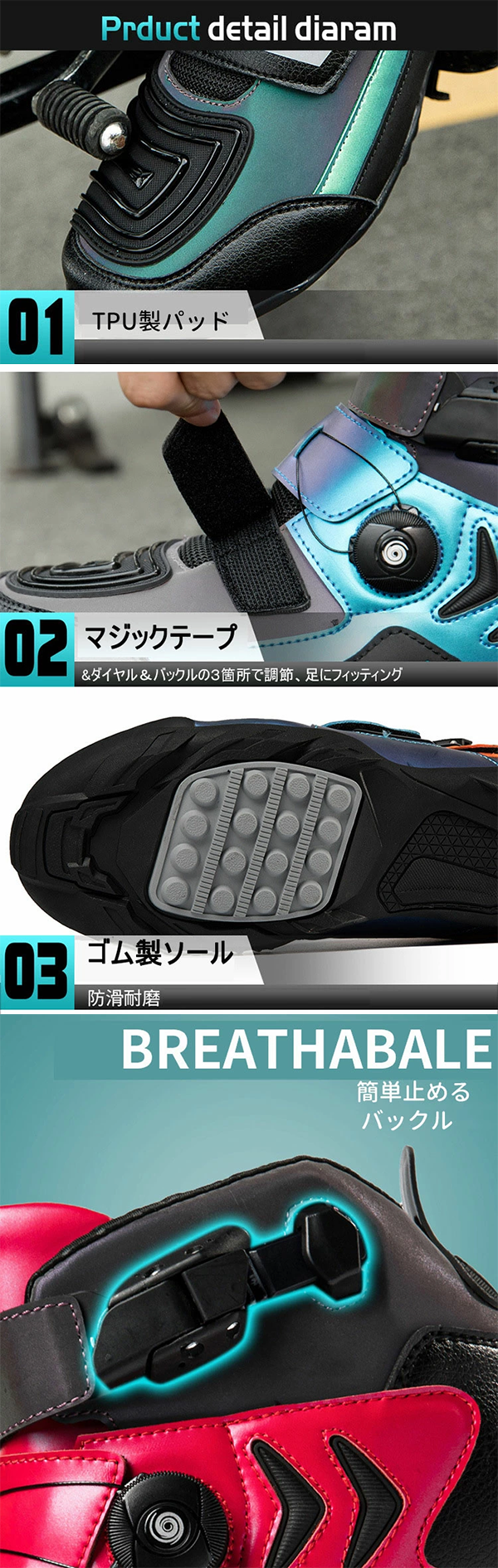 - バイクのペダル操作を妨げないように設計されており、特に左足側のシフトチェンジ部分にはパッドが設けられています。
