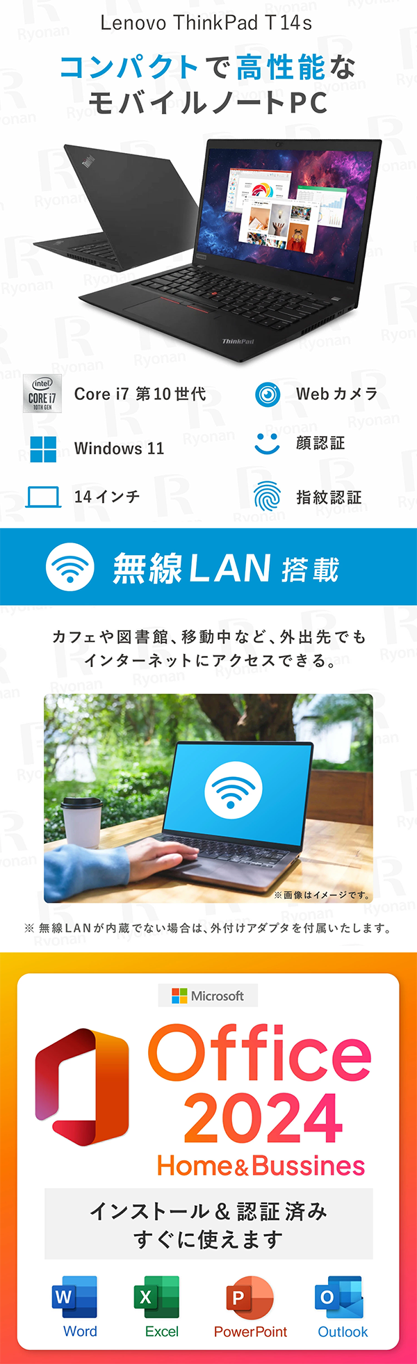 - Lenovo ThinkPad T14s Gen 1(Core i7-10610U、メモリ 32GB、SSD 1TB、無線LAN、Microsoft Office 2024 H&B搭載)は、高いパフォーマンスと携帯性を兼ね備えた魅力的なビジネス向けノートパソコンです。