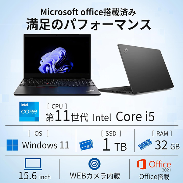 ■注目のおすすめの一台! 【整備済み品】ノートPC レノボ Thinkpad L15 GEN2 15.6型 Core i5-1135G7 11世代 Office 2021 Wi-Fi6 SSD 1TB メモリ 32GB Windows11