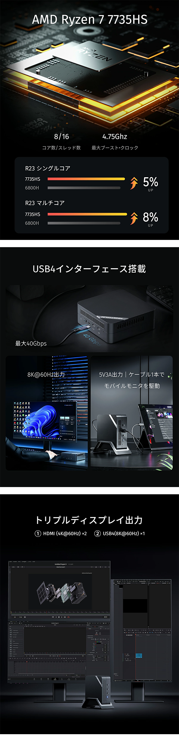 Toggle【商品の説明】新品 ミニデスクトップパソコン PC MINISFORUM UM773 Lite Windows11 CPU AMD Ryzen7 7735HS メモリ 32GB SSD 1TB 無線LAN Wi-Fi6 モニター なし 3画面同時出力
