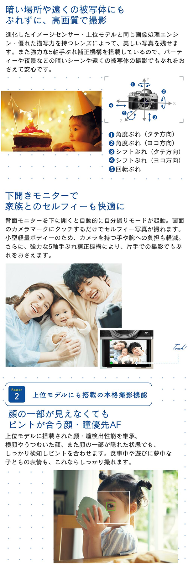 - 5軸手ぶれ補正機構を搭載しており、暗い場所や望遠撮影時でも手ぶれを効果的に抑えます。
