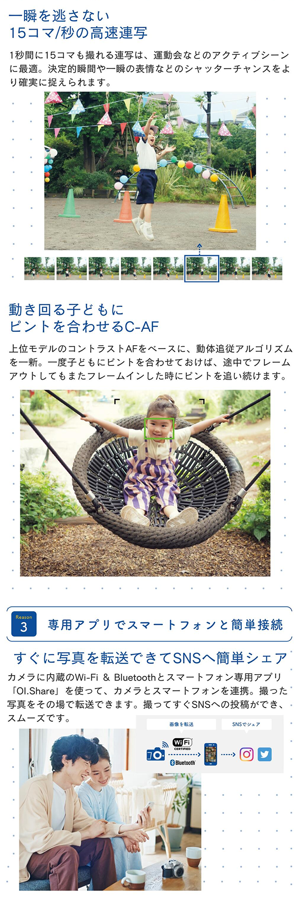 - タッチ操作で素早くピントを合わせるタッチAFや、多様なカラーモードなど、撮影をサポートする機能が豊富です。