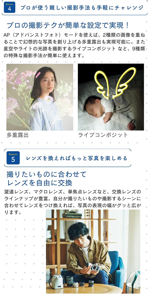 - セルフィー対応モニターはチルト式で、自分撮り(セルフィー)も簡単に行えます。