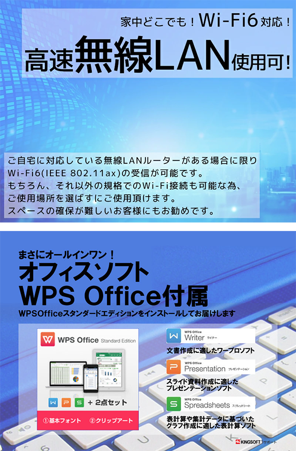- 付属ソフト WPS Office(表計算・ワープロ・プレゼンテーション)