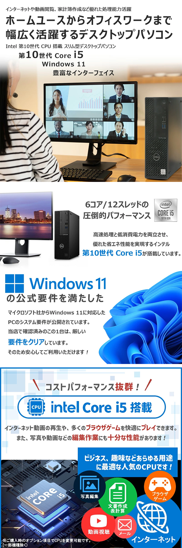 - 第10世代Core i5プロセッサーを搭載し、メモリやSSDの構成を様々に選択できる省スペース型(SFF)デスクトップパソコンです。