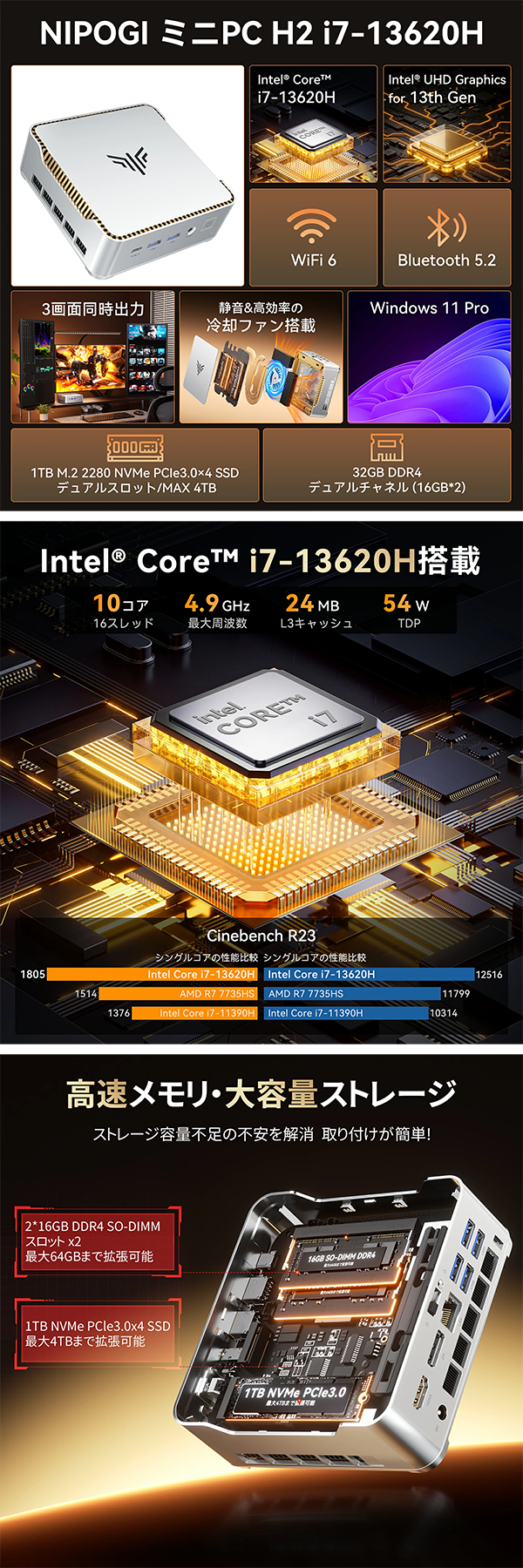 Toggle【商品の説明】新品 ミニデスクトップパソコン PC NiPoGi H2 Windows11 CPU 13世代 Intel Core i7-13620H メモリ 32GB SSD 1TB 無線LAN Wi-Fi6 モニター なし 3画面同時出力