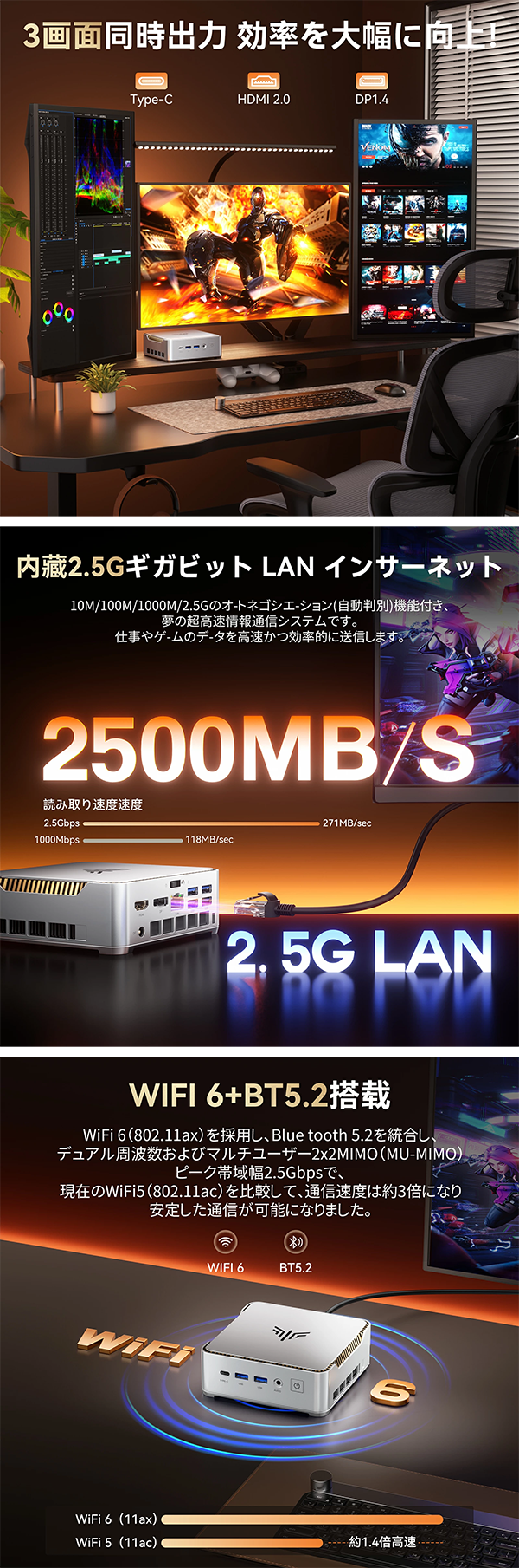 - Wi-Fi 6とBluetooth 5.2に対応し、高速で安定したワイヤレス接続が可能です。