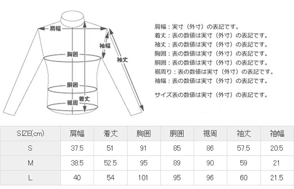 | Size | 肩幅 | 着丈 | 胸囲 | 胴囲 | 裾周 | 袖丈 | 袖幅 |