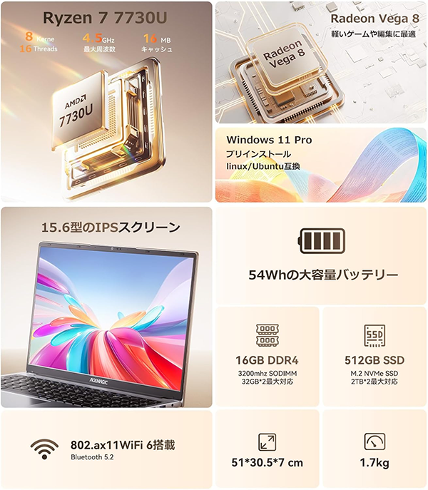 - ACEMAGIC RX16 ノートパソコンは、非常にコストパフォーマンスが高いと評価されており、高性能なCPUを搭載しながら比較的手頃な価格で入手可能です。