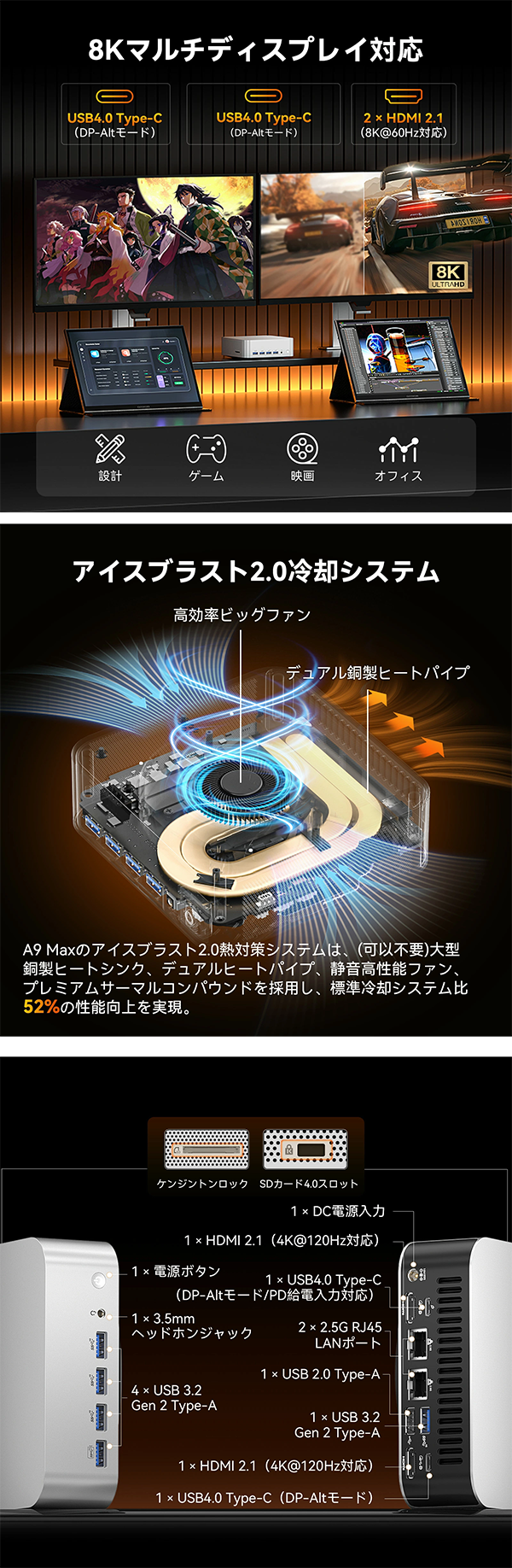- インターフェース USB 3.2 Gen 2 Type-A*5、 USB 2.0 Type-A *1、 USB 4 Type-C ( DP-Altモード / PD給電入力対応 ) *1、 USB 4 Type-C ( DP-Altモード ) *1、 DC電源入力 *1、 HDMI 2.1 (4K@120Hz対応) *2、 電源ボタン *1、 3.5mmヘッドホンジャック *1、 ケンジントンロック *1、 2.5GRJ45LANポート *2、 SDカード4.0スロット *1