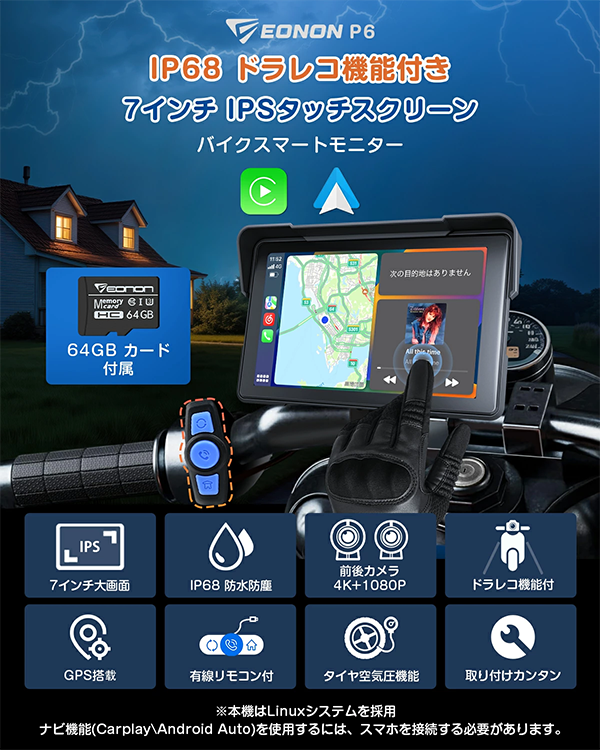 - EononのP6は、7インチの大型IPSタッチスクリーンを搭載したバイク用スマートモニターです。