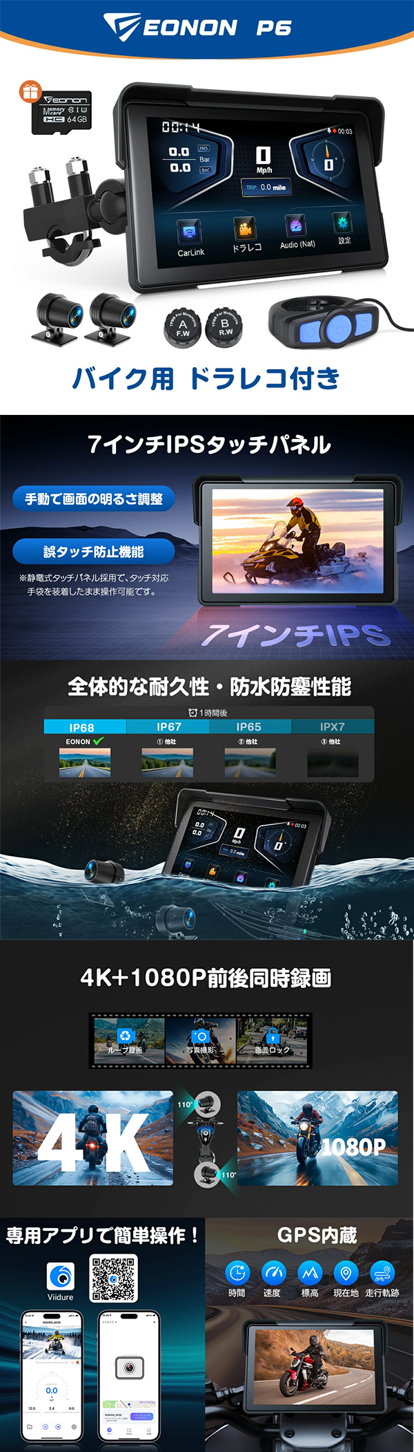 Toggle【商品の説明】バイク スマートモニター ドラレコ ナビ P6 EONON