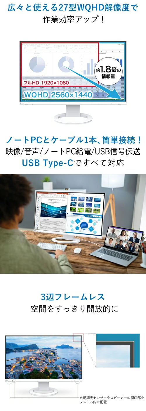 - EV2720Sは、27型WQHD(2560×1440)解像度の3辺フレームレスモニターです。