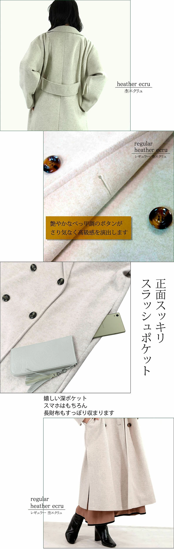 - 軽く羽織るだけでさまになるコートで、何といっても杢の落ち着いた素材感とビッグシルエットとサイドスリットが抜け感を演出します。