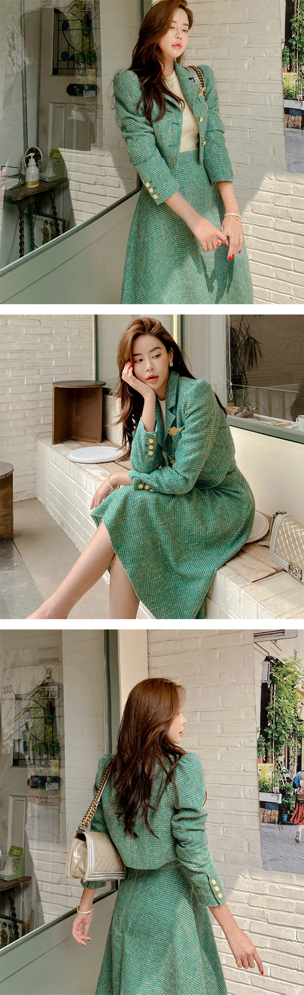 - ショート丈のジャケットとハイウエストスカートの組み合わせでスタイルアップ効果あり◎