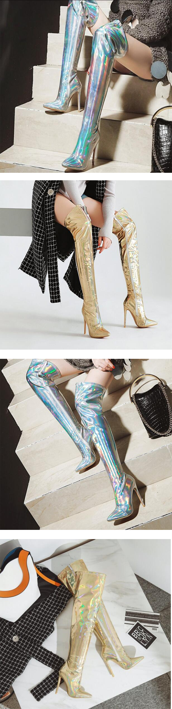 ▶ シルバーとゴールドのエナメルのニーハイ・サイハイブーツ
