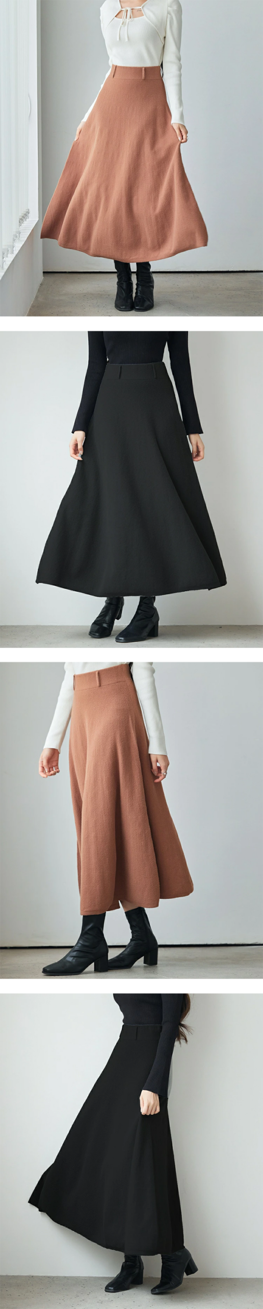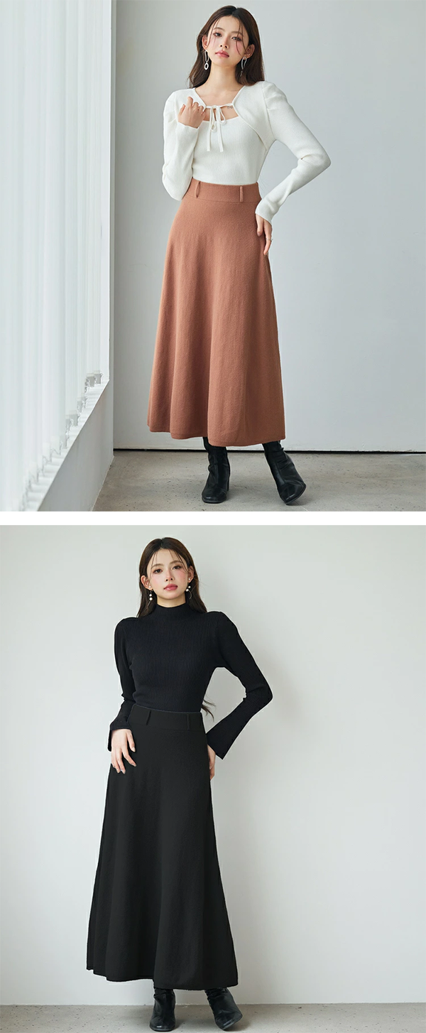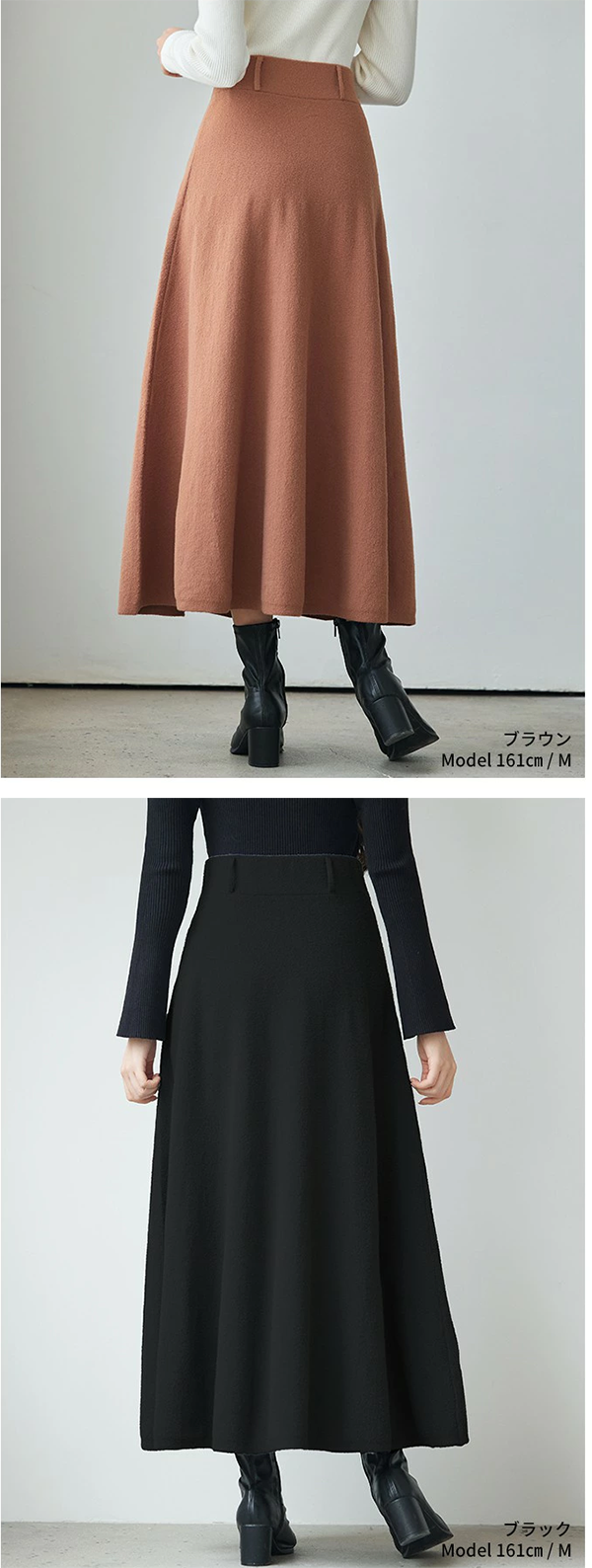 - 着回し力高めのベーシックシルエットで、すっきりとした腰回りから裾にかけて広がるミモレ丈のフレアニットスカートです。