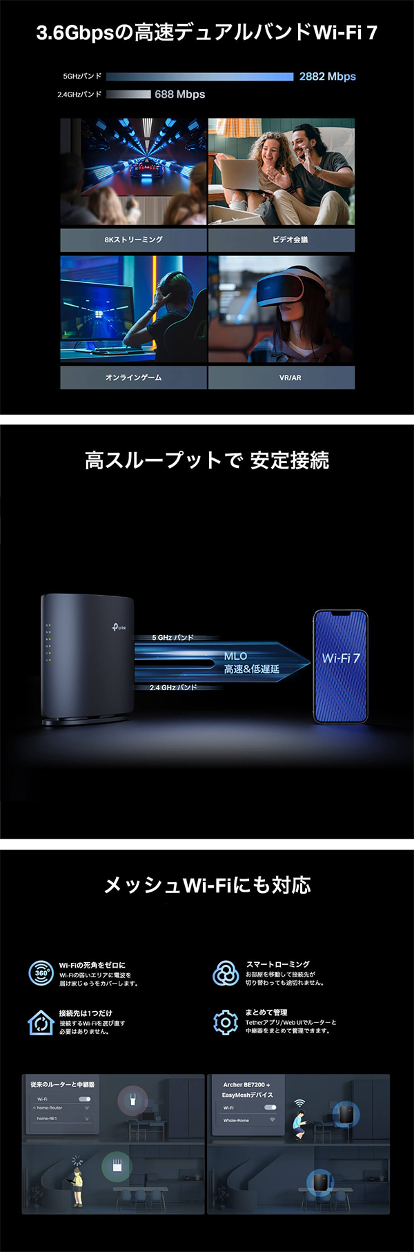 - 【Wi-Fi 7対応】最大3600Mbps(5GHz: 2882Mbps + 2.4GHz: 688Mbps)のデュアルバンドに対応。MLO・4K-QAMなどWi-Fi 7の最新技術で、ラグや接続切れを防ぎ、快適なオンラインゲーム&ストリーミング体験を提供。