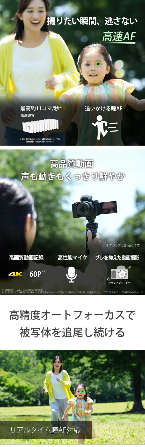 - AF/AE追従 最高約11コマ/秒連写、最高約8コマ/秒のサイレント連写が可能