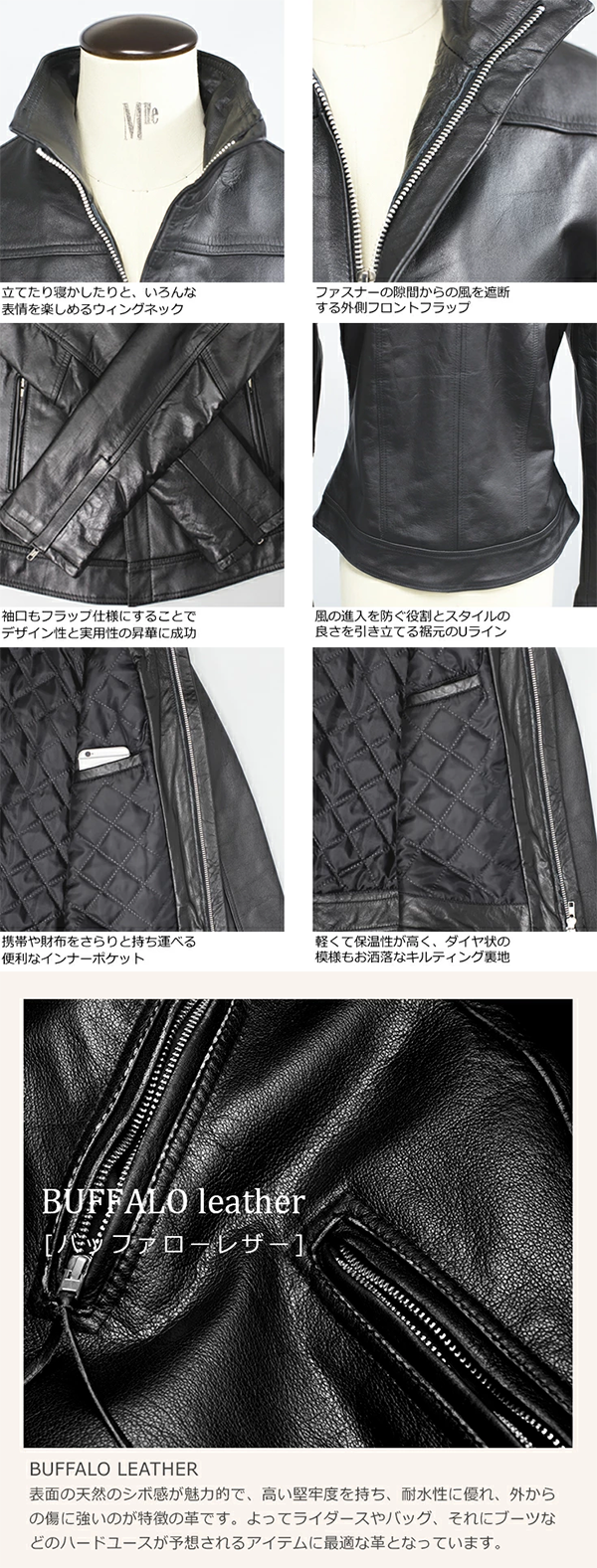 - ハイネックの襟と裾のUライン、 またウエストのくびれなど、 ワイルドな要素の中にも女性らしいラインを意識したウィメンズ用ライダースジャケットです。
