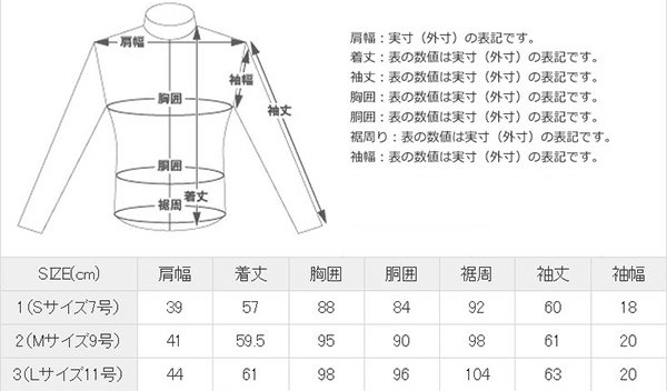 - Lサイズ: 着丈53cm バスト92cm 肩幅39cm 袖丈57cm