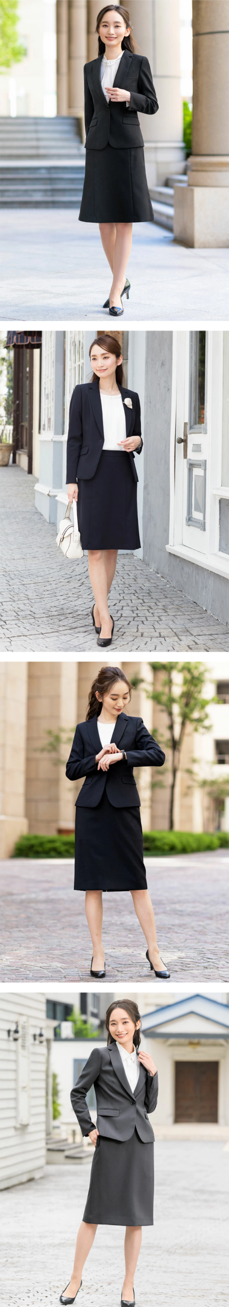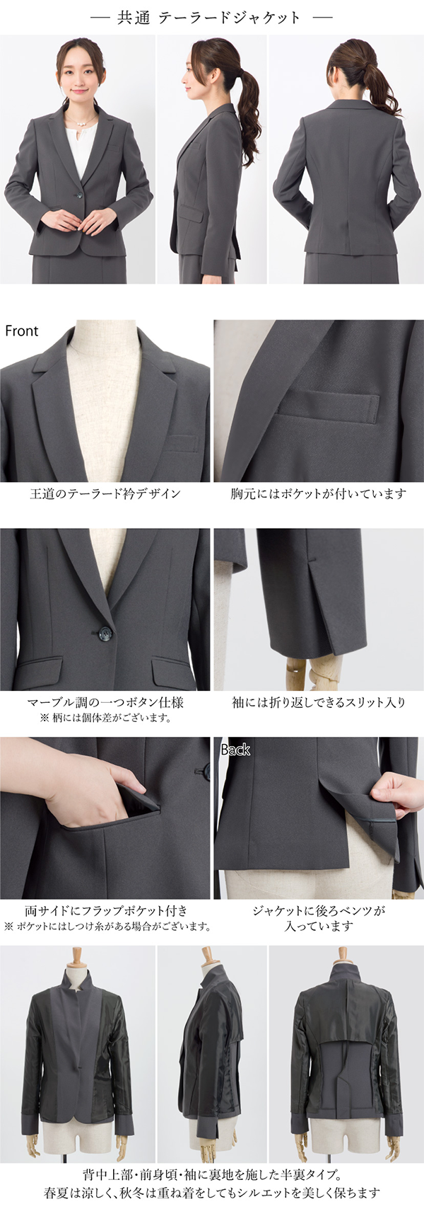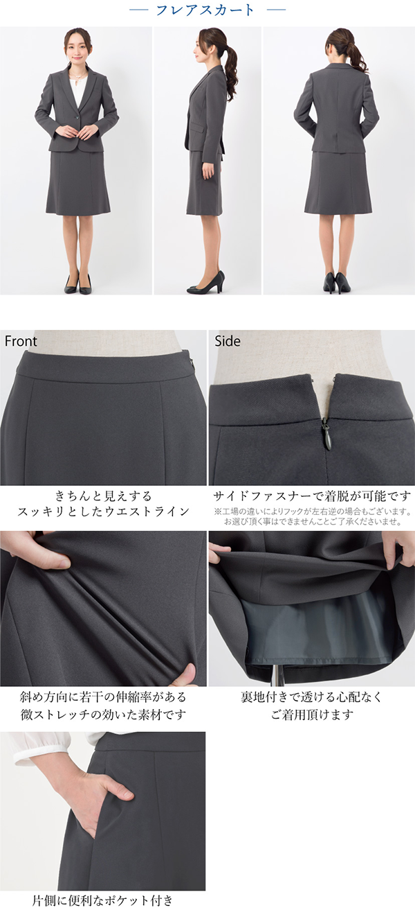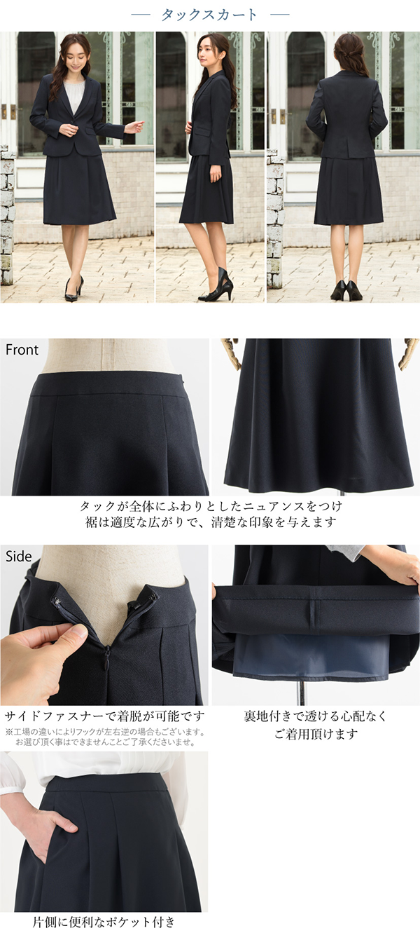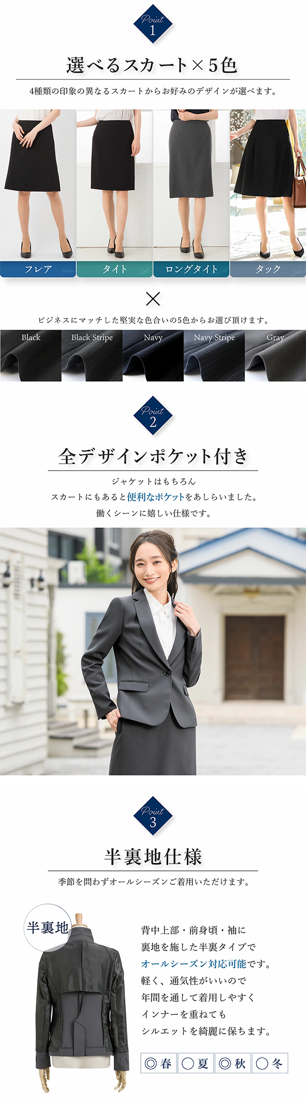 - スカートのデザインを選べる、通気性抜群のオールシーズン対応スーツです。